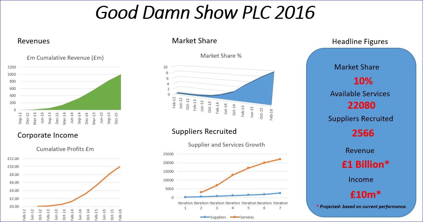 Even though the Dragons from the Den may be disappointed about margins (1%) they could not fail but to be impressed by the growth stats. Your Dragons are different however, as stakeholders they set the margins you could make, and your other objectives too. You are the Government Digital Service (GDS) and you are presenting the G Cloud figures.
